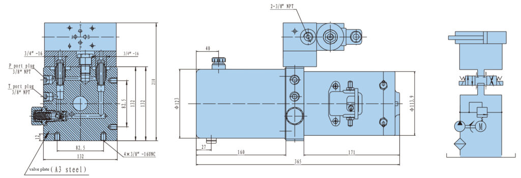 Consiting of gear pump, DC motor, multi-functions manifold, valves, tank, this power unit is for the controlling of a double acting cylinder with a pressure holding charateristic. It is used in the applications of tipper trailer, hydraulic hoist, press, etc.